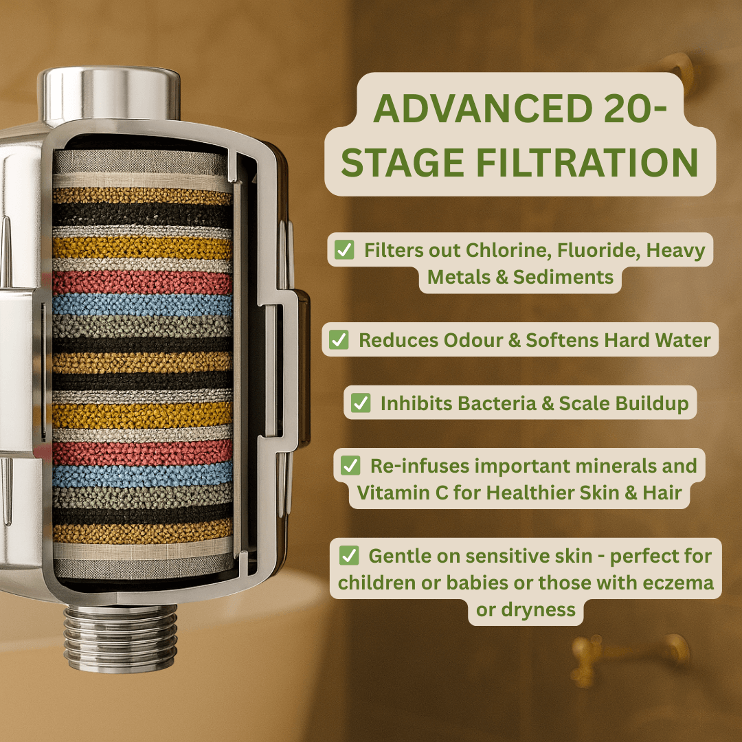 Our 20-stage filtration system uses a blend of KDF55, activated carbon, Vitamin C, and mineral stones to remove up to 98% of chlorine, heavy metals, and hidden contaminants.